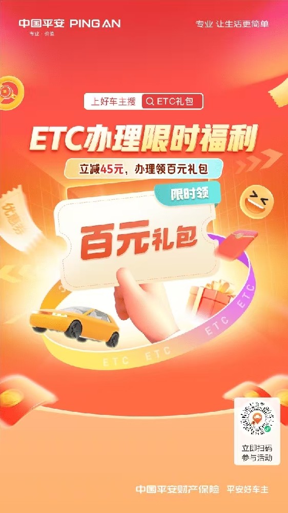 【ETC办理限时福利】即日起至12月31日ETC办理立减45元!再领百元大礼包!车主、健康、···